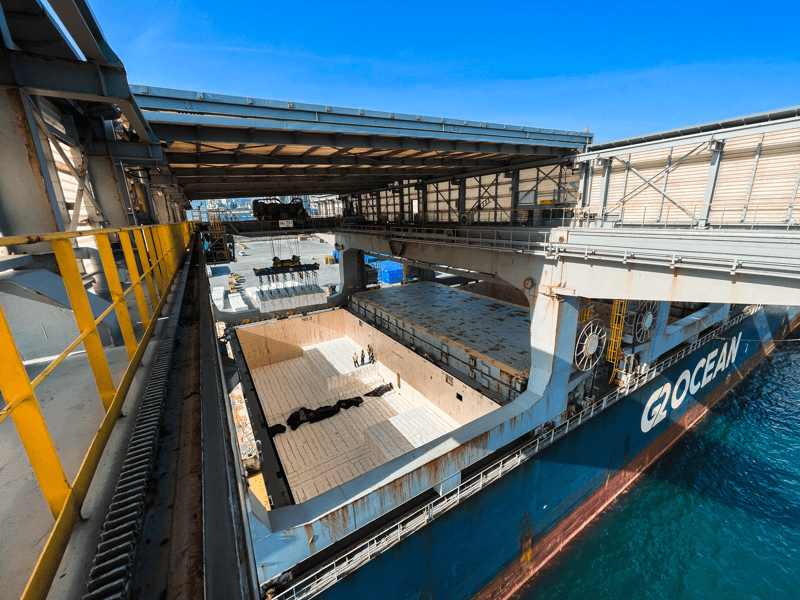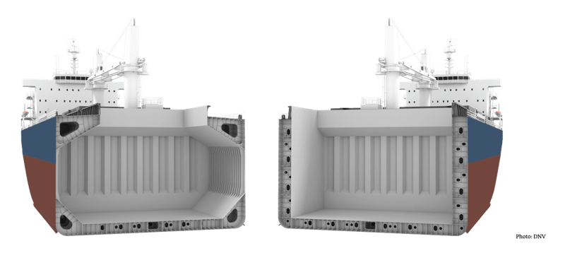 Open Hatch vessels are a type of multi-purpose vessel, and are sometimes confused with bulk vessels. There are some significant differences, however, in particular how bulk vessels have a narrow hatch opening, while OH-vessels have full-width opening. This makes each hold as accesible as possible, perfect for parcelled goods of any kind. The image shows the difference, with conventional bulk to the left, and Open Hatch to the right.